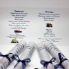 Un meniu elegant, cu marginea ondulata/zig-zag, pe foi de calc A4. Este personalizat cu masinute din Cars, apoi prins cu fundita dintr-o panglica subtire, rafinata din satin/organza.
