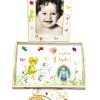 Setul contine: tavita, perie si oglinda & rama foto. Produsele sunt pictate in culori acrilice si innobilate, prin tehnica decoupage, cu fluturi, flori, inimioare, fotografia fetiei si mesajul „La multi ani, Amalia!”. Detaliile privind numele si data motului sunt incluse.